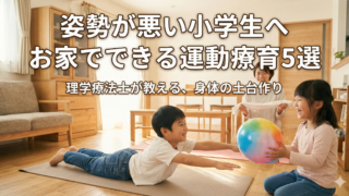 小学生の姿勢が悪い原因は?理学療法士が脳科学的根拠に基づいて解説します。自宅で楽しくできる運動療育遊び5選を紹介。発達が気になる子の体幹や固有受容覚を鍛え、学習の土台を作りましょう。