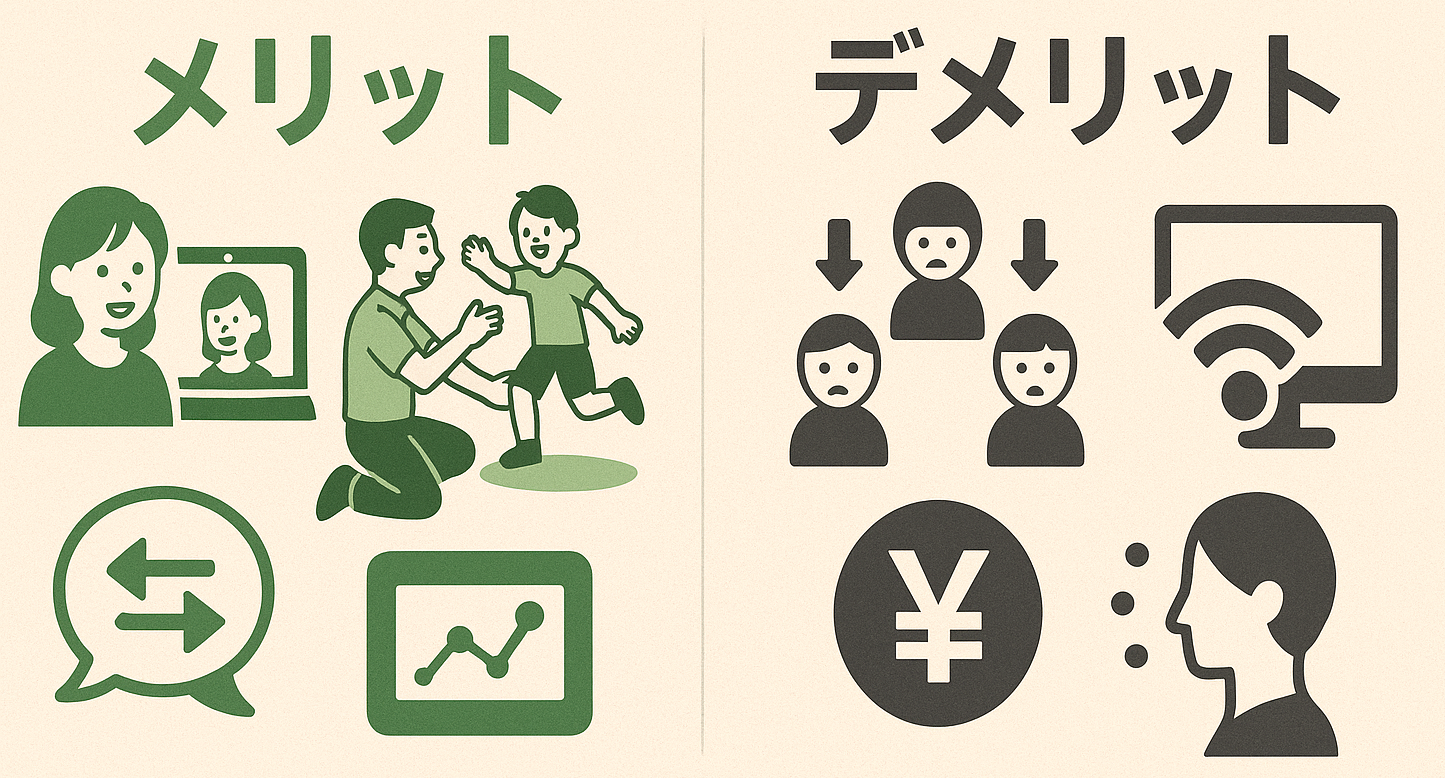 集団適応や社会性の経験を主目的にする場合は通所型の方が適することがある。 - 通信環境・デバイスの準備が必要