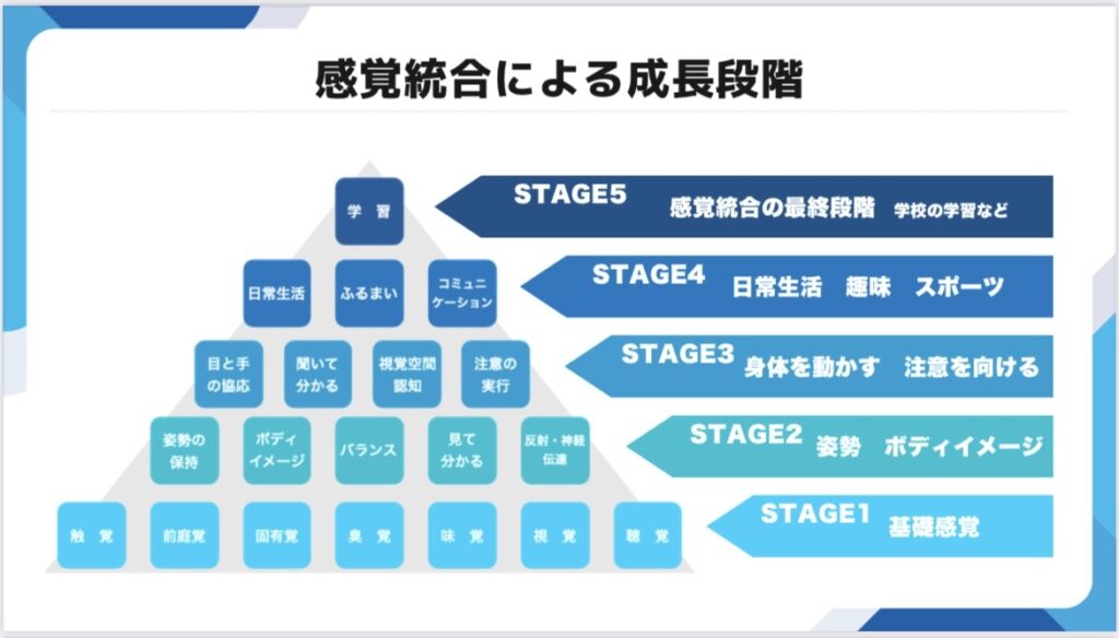 私たちが「発達のピラミッド」と呼ぶ考え方では、土台となるのは以下のような感覚です。