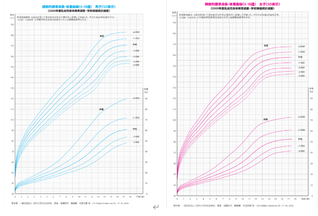 日本では、厚生労働省や日本小児内分泌学会のデータに基づく「SDスコア(標準偏差)」が用いられます。