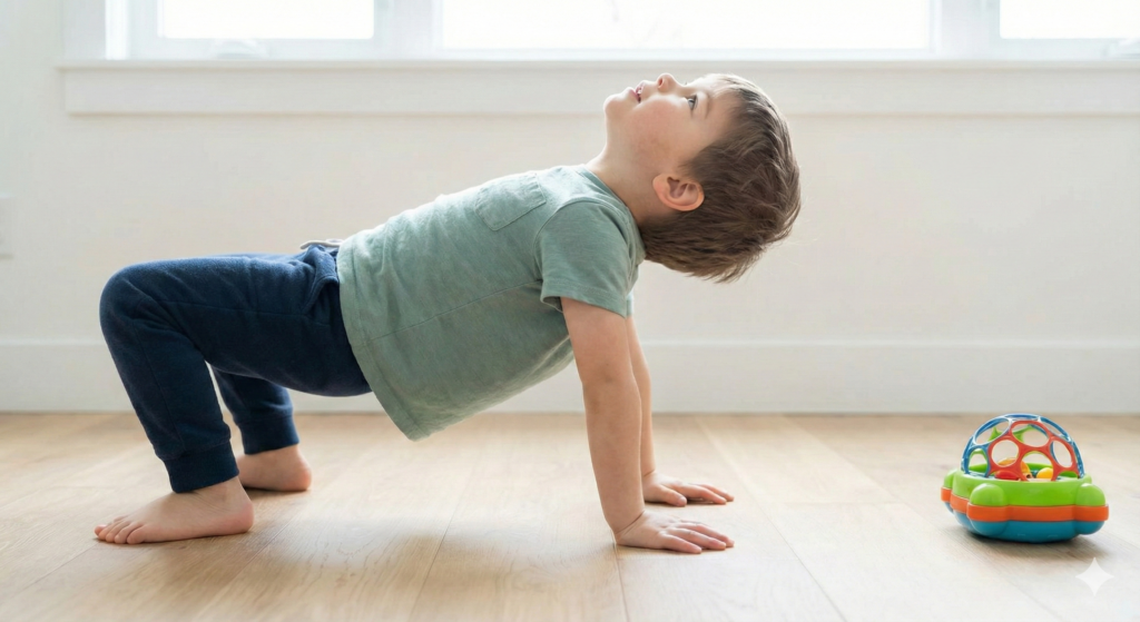 また、普段縮こまっている胸郭(胸周り)を開く姿勢になるため、呼吸が浅くなりがちな姿勢の悪い子にとって、呼吸機能を高めて脳への酸素供給を助ける効果も期待できます。 - PTのポイント: