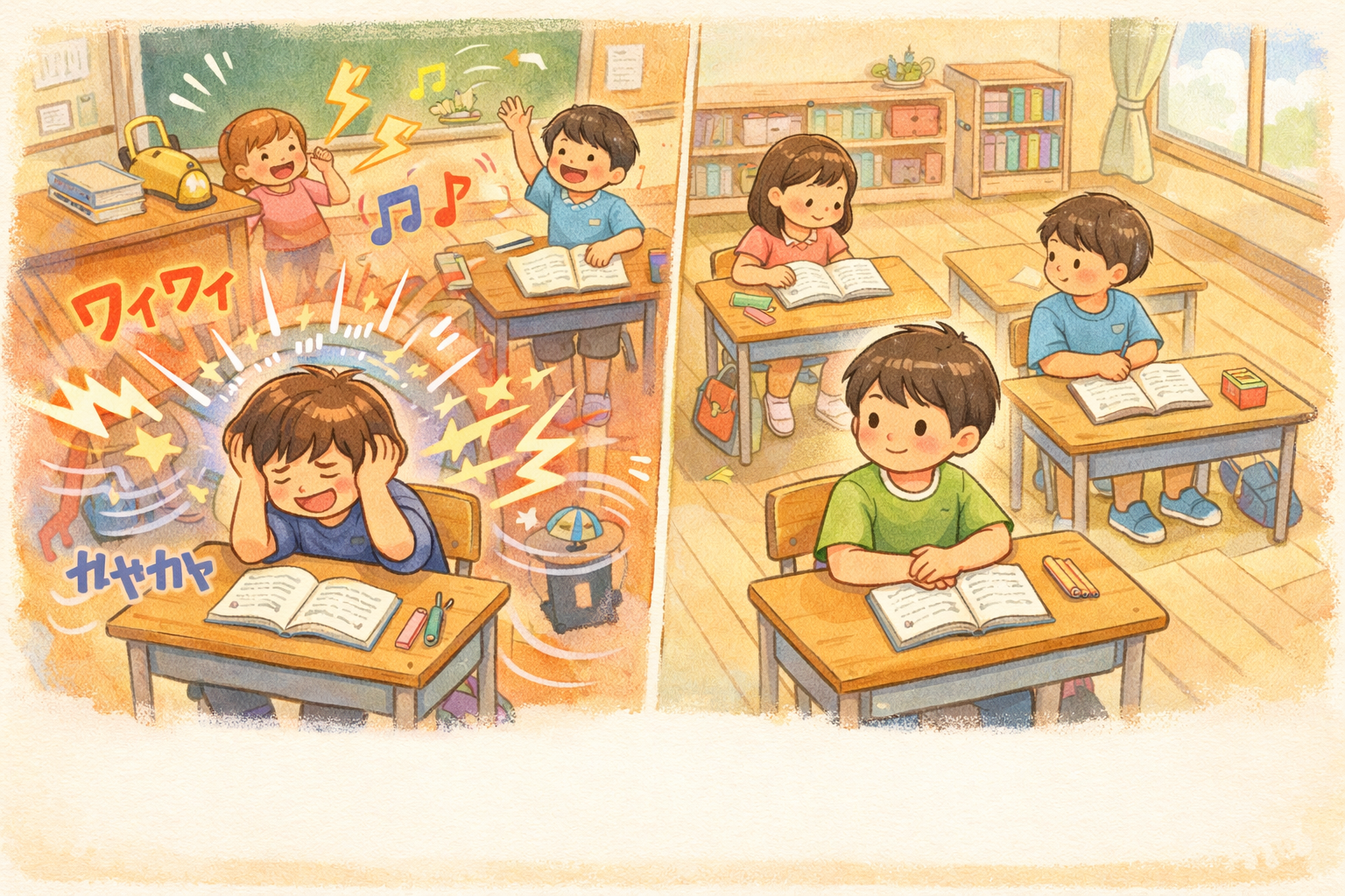 集団生活では、音・視覚・身体感覚など複数の刺激が同時に入ってきますが、